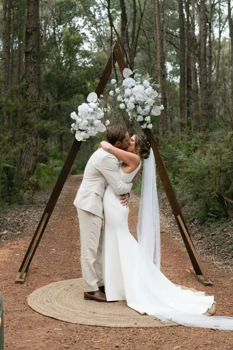 A bride and groom kissing beneath a wooden triangle wedding arch decorated with white flowers, set in a forest clearing.